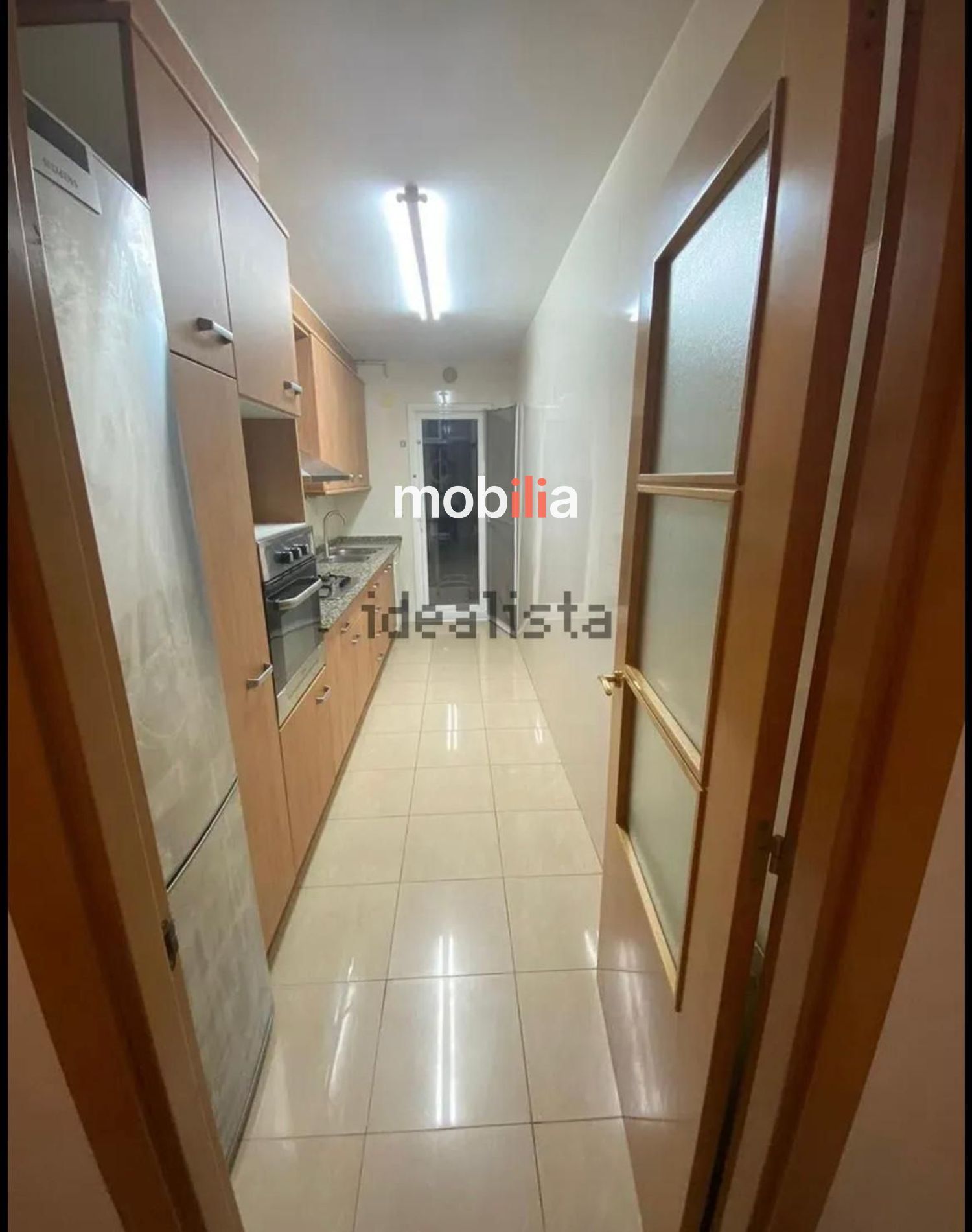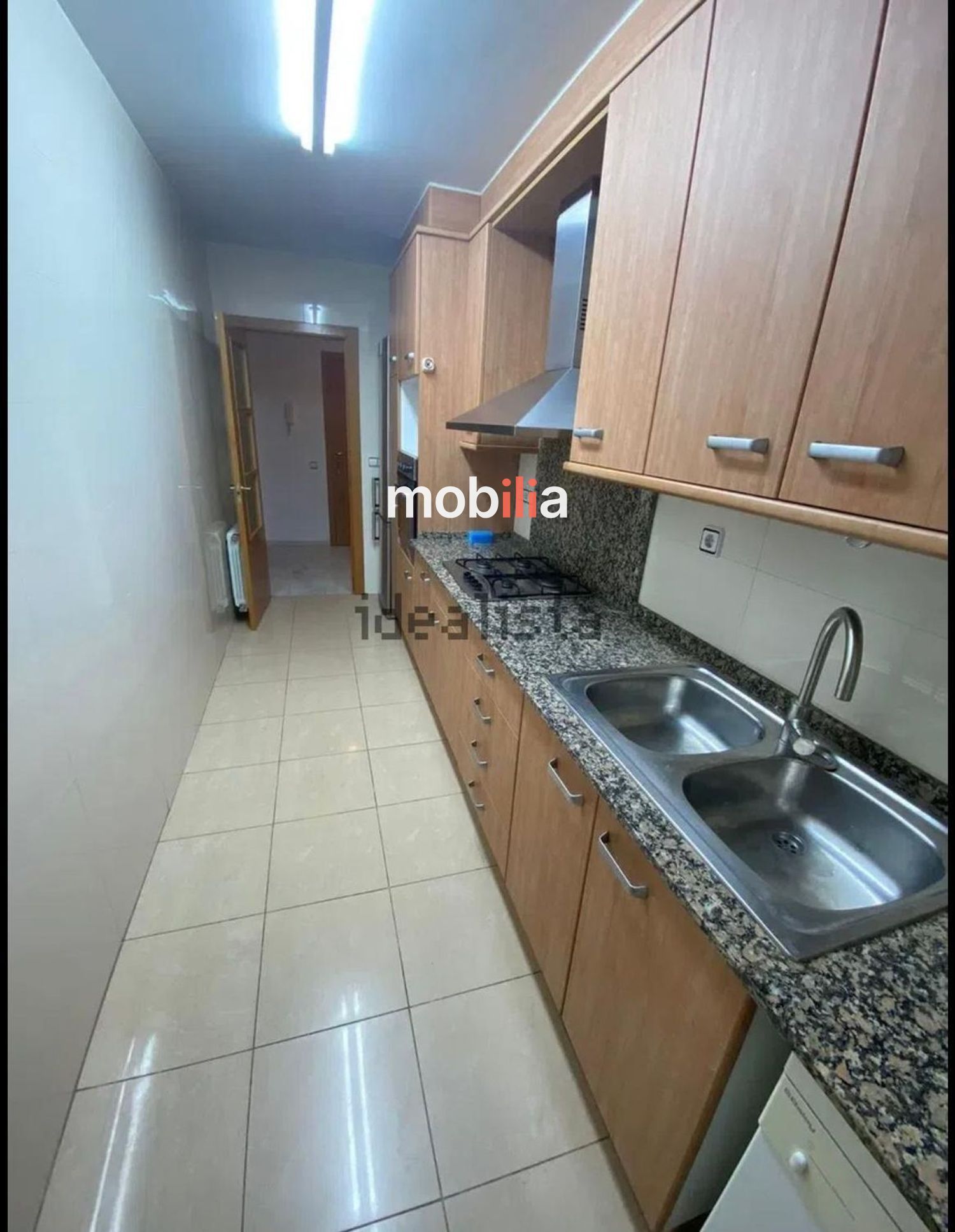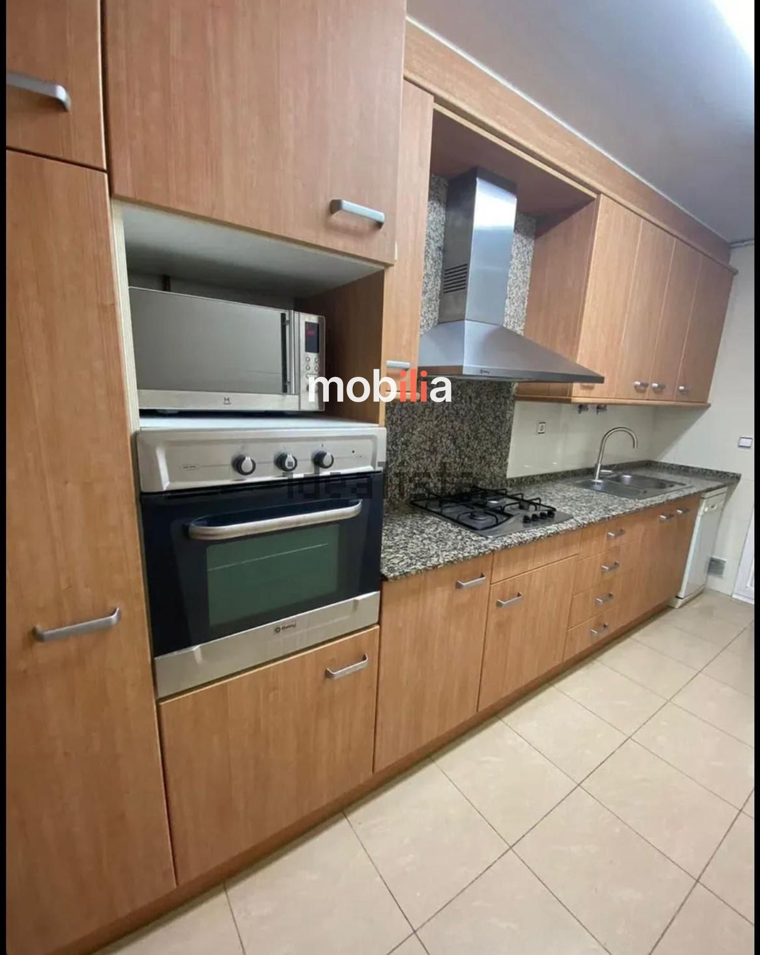 Se destaca la cocina equipada con encimera de granito, barra de granito y mobiliario en tono madera, con horno, estufa de cuatro quemadores, microondas empotrado y campana extractora. Amplios armarios bajos y altos proporcionan soluciones de almacenamiento útiles y ordenadas. El suelo cerámico claro aporta luminosidad y facilita la limpieza, mientras que la sala-comedor integrada ofrece un espacio amplio para mobiliario y convivencia.