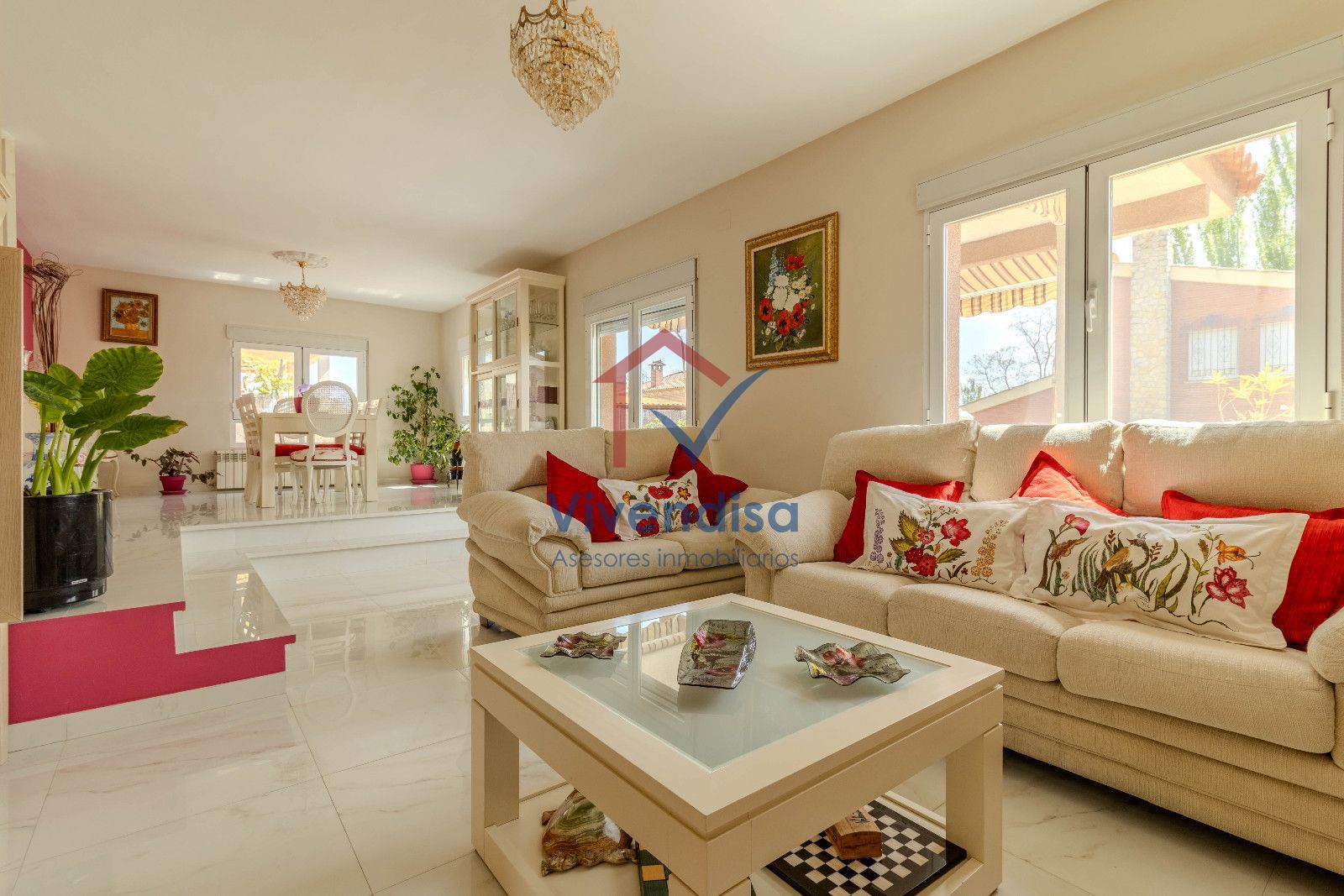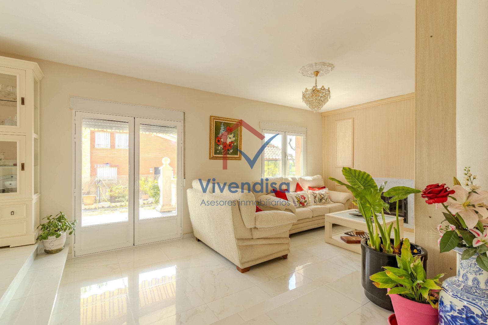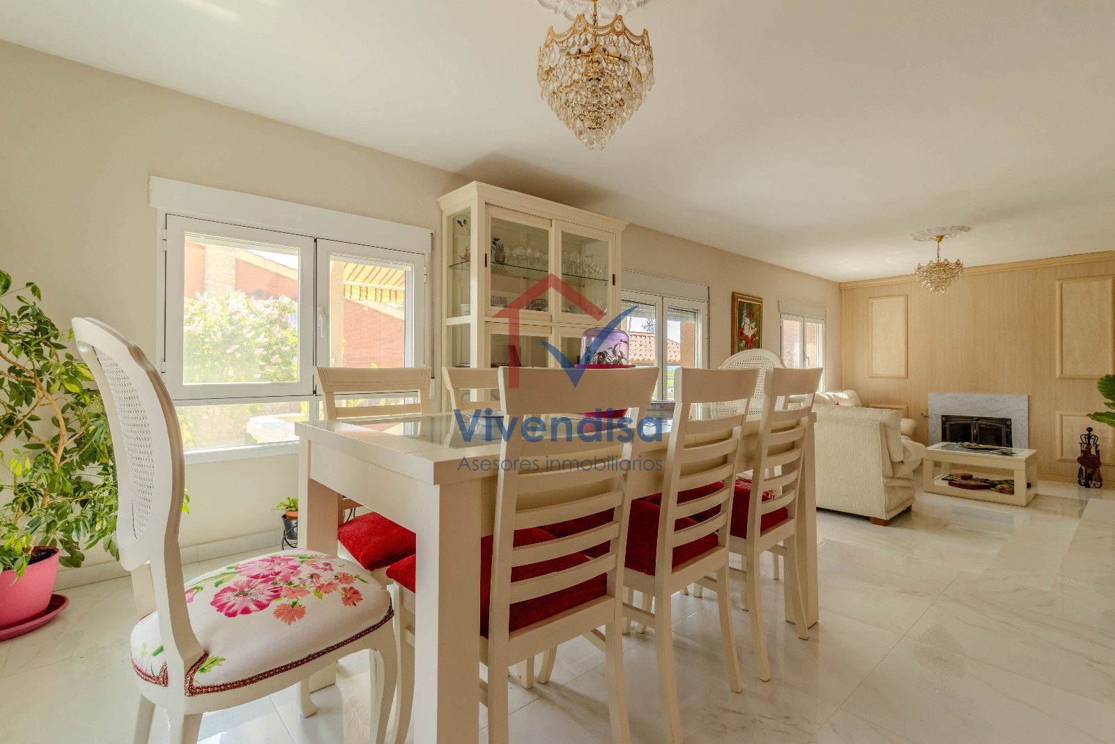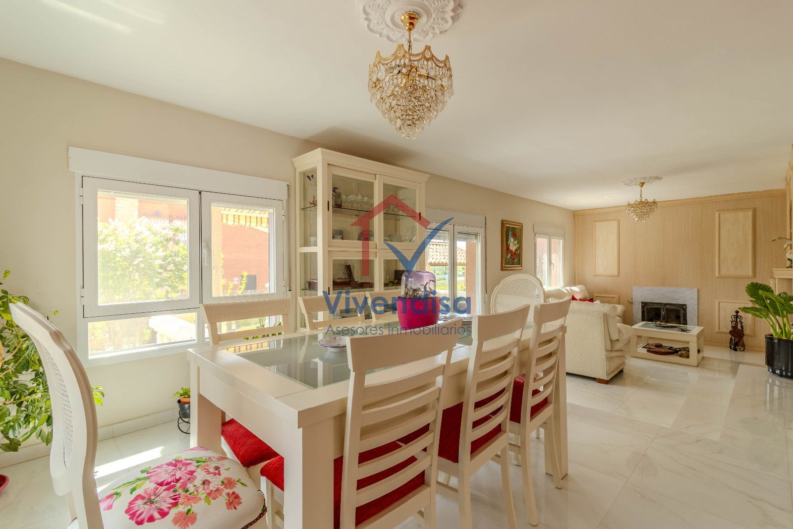 La planta principal se abre a un salón a doble altura, muy luminoso gracias a sus tres grandes ventanales y salida directa al porche, creando un espacio acogedor y elegante.
