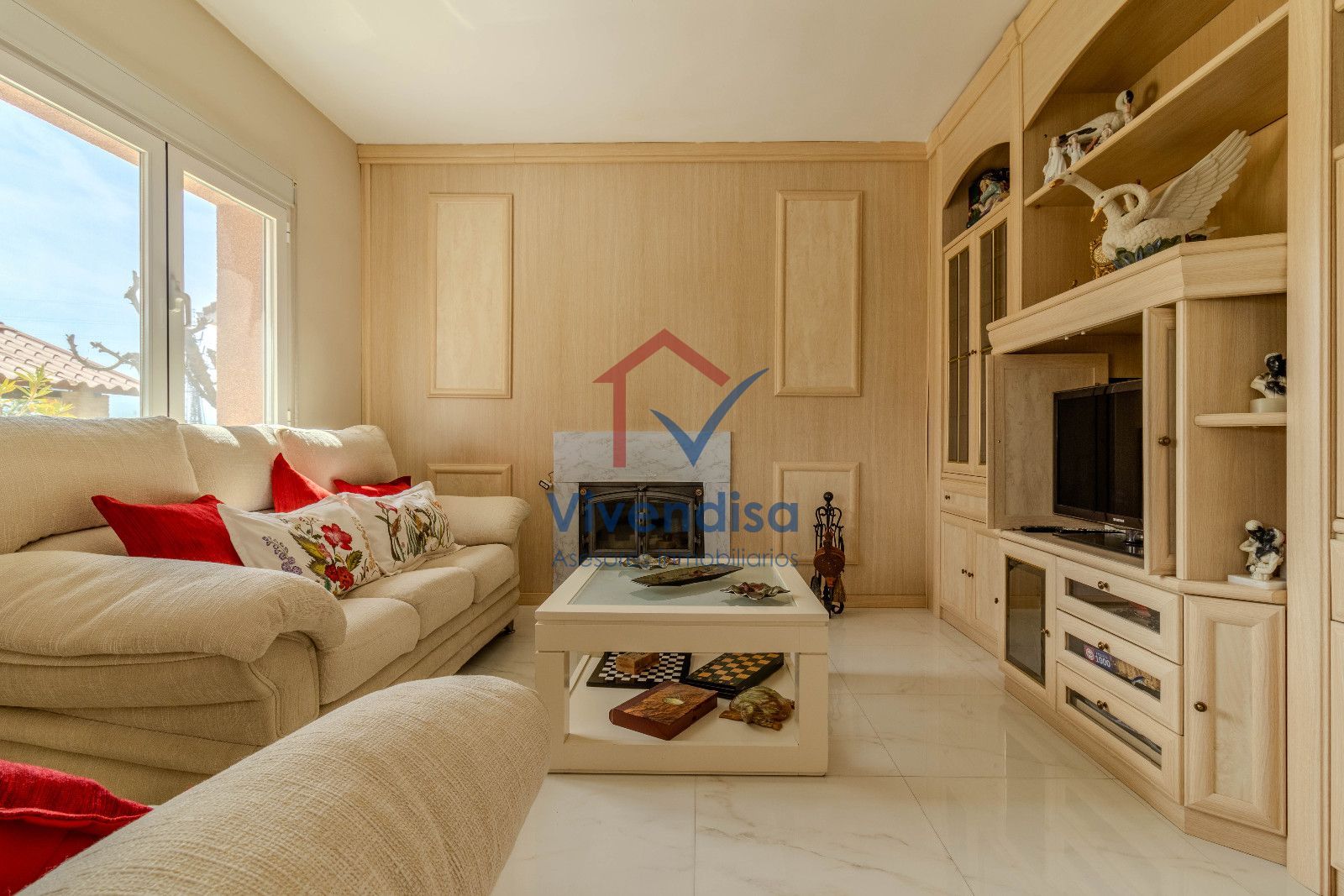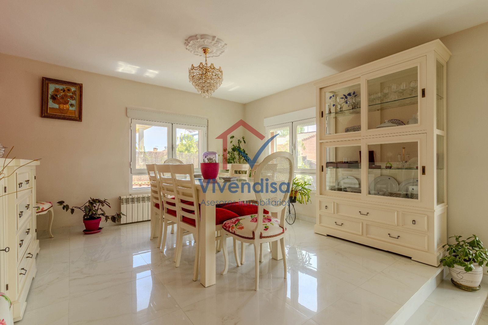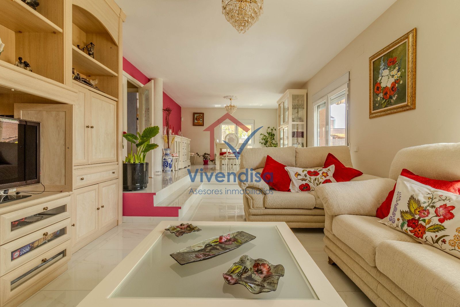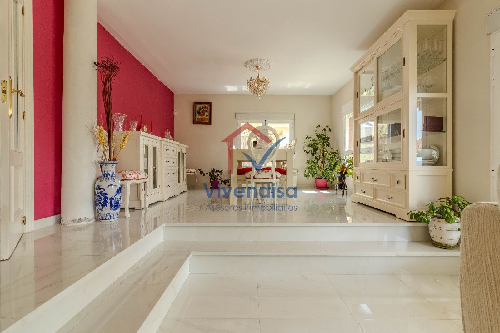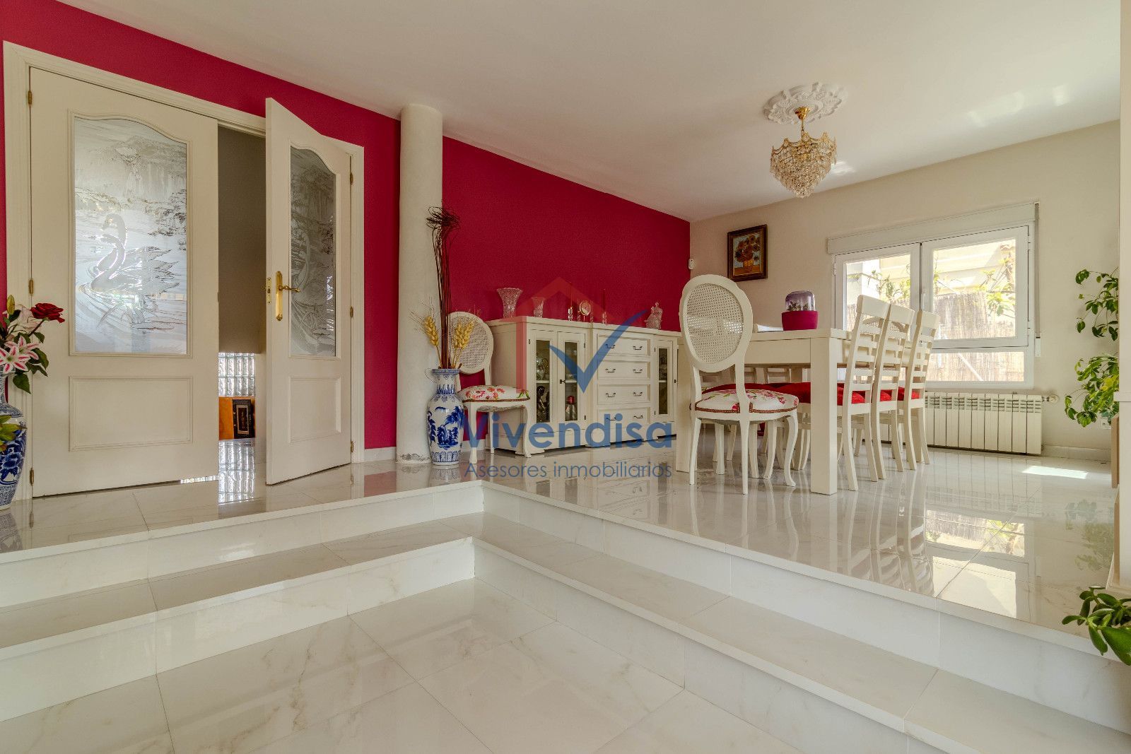 La planta principal se abre a un salón a doble altura, muy luminoso gracias a sus tres grandes ventanales y salida directa al porche, creando un espacio acogedor y elegante.