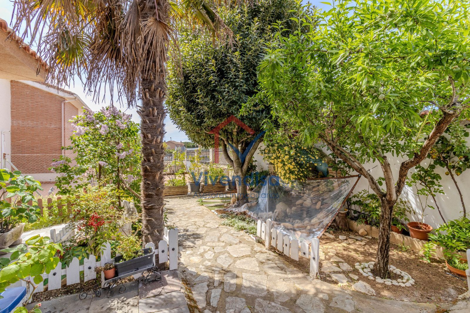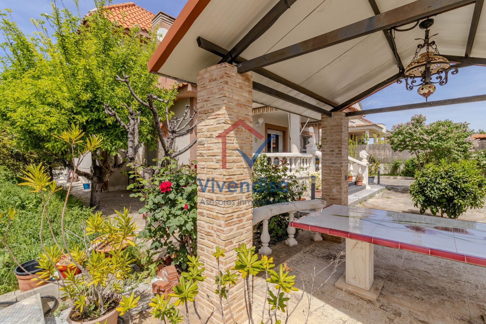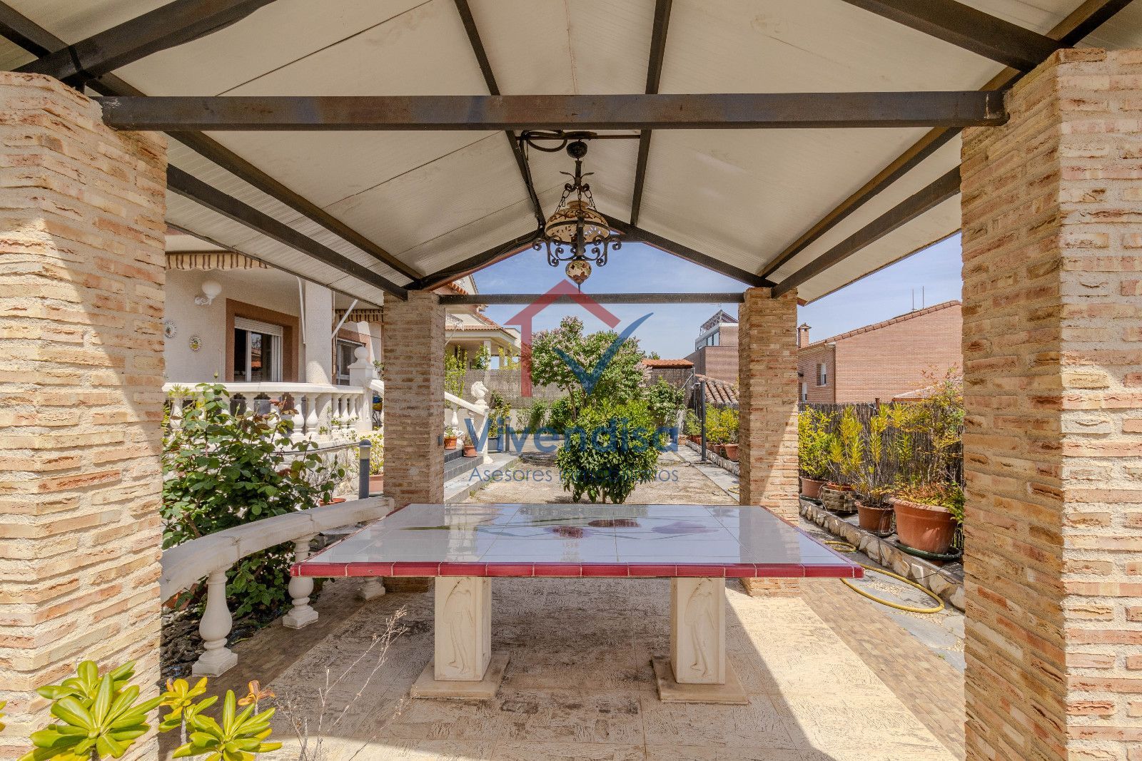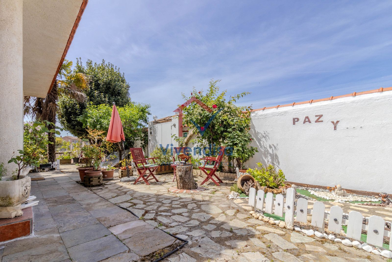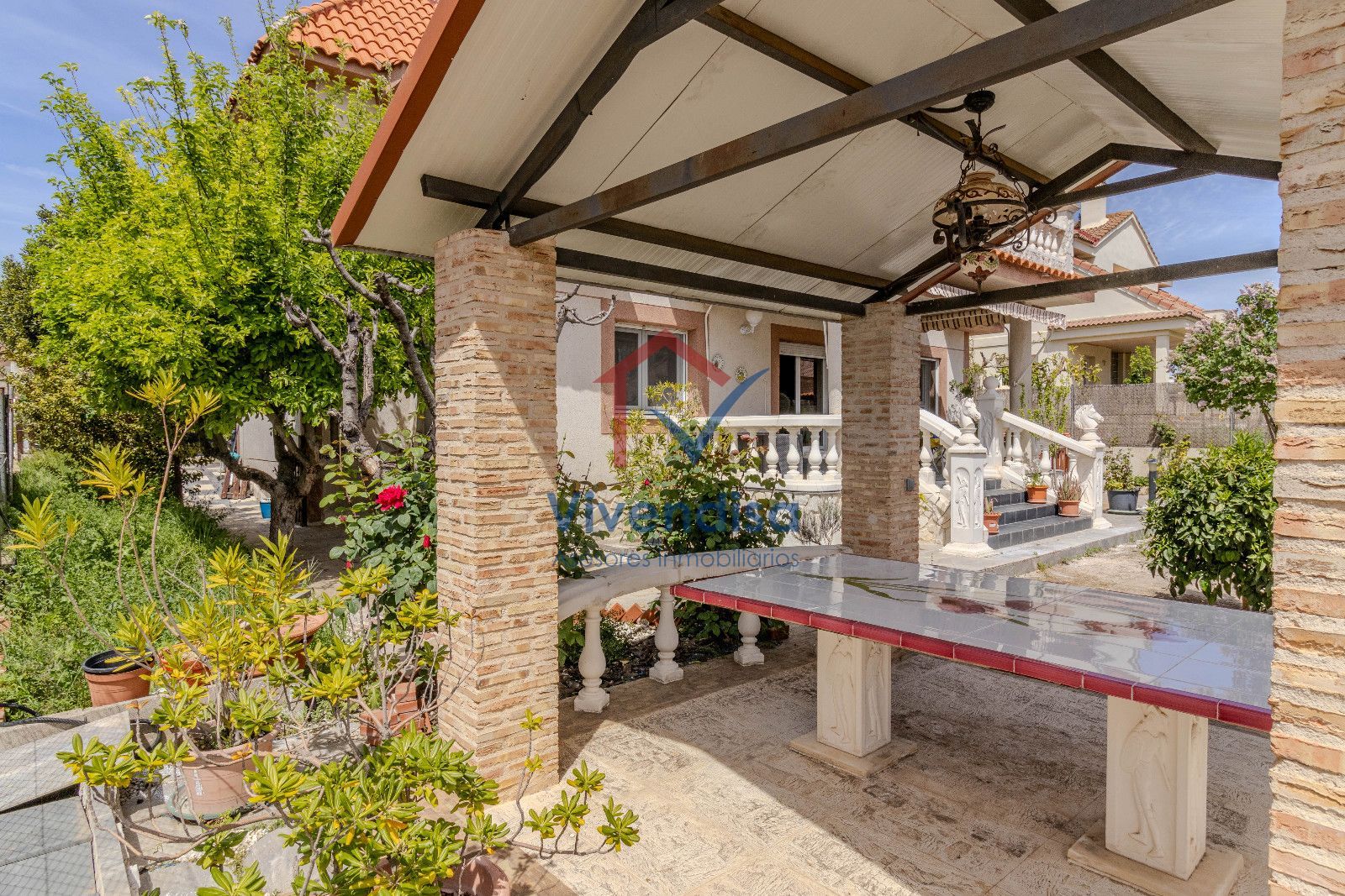 Desde esta planta se accede al jardín, mayoritariamente solado en hormigón, de muy fácil mantenimiento, con detalles en pizarra en la zona frontal y un cenador de obra con mesa integrada, perfecto para comidas y celebraciones al aire libre.