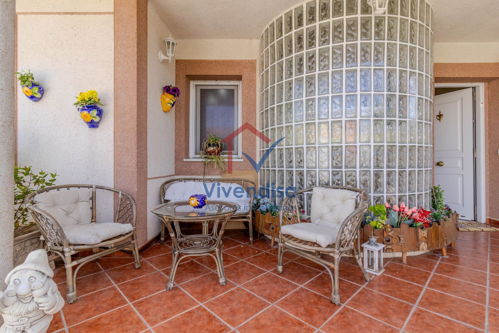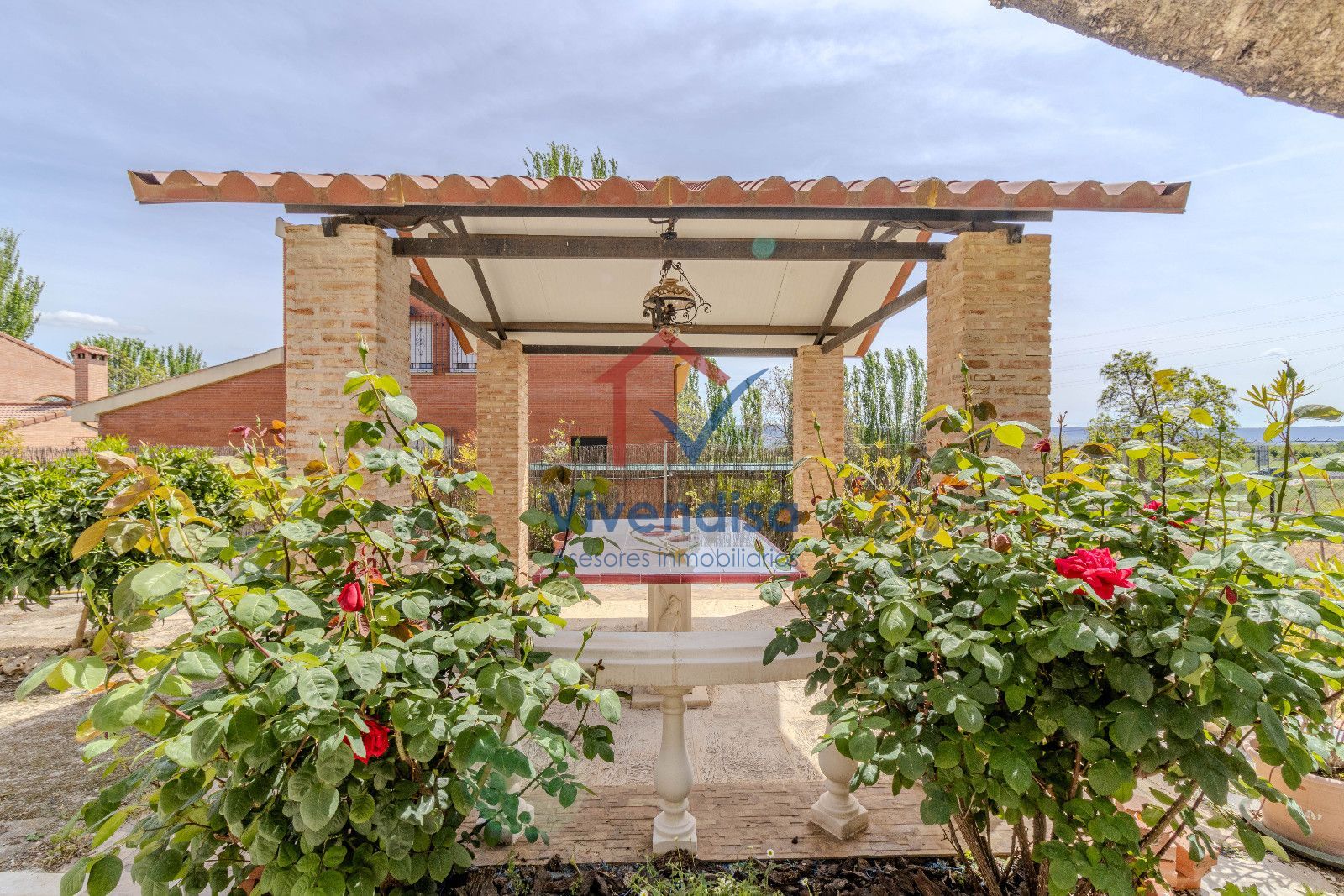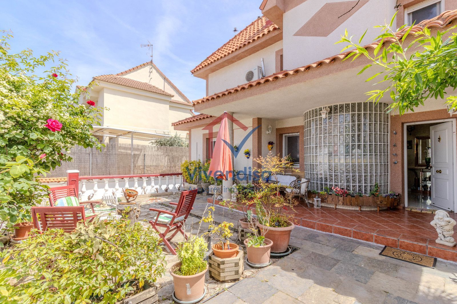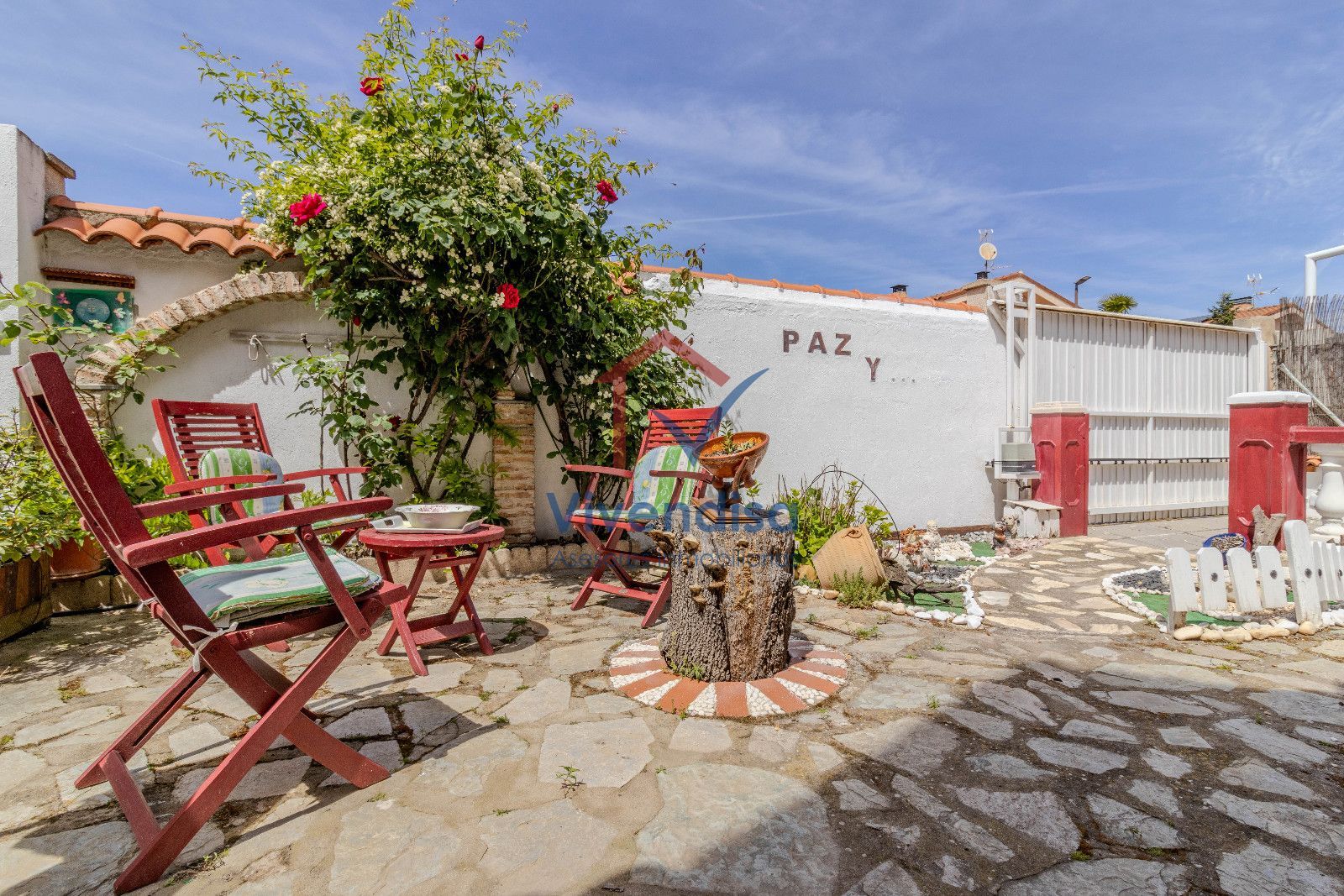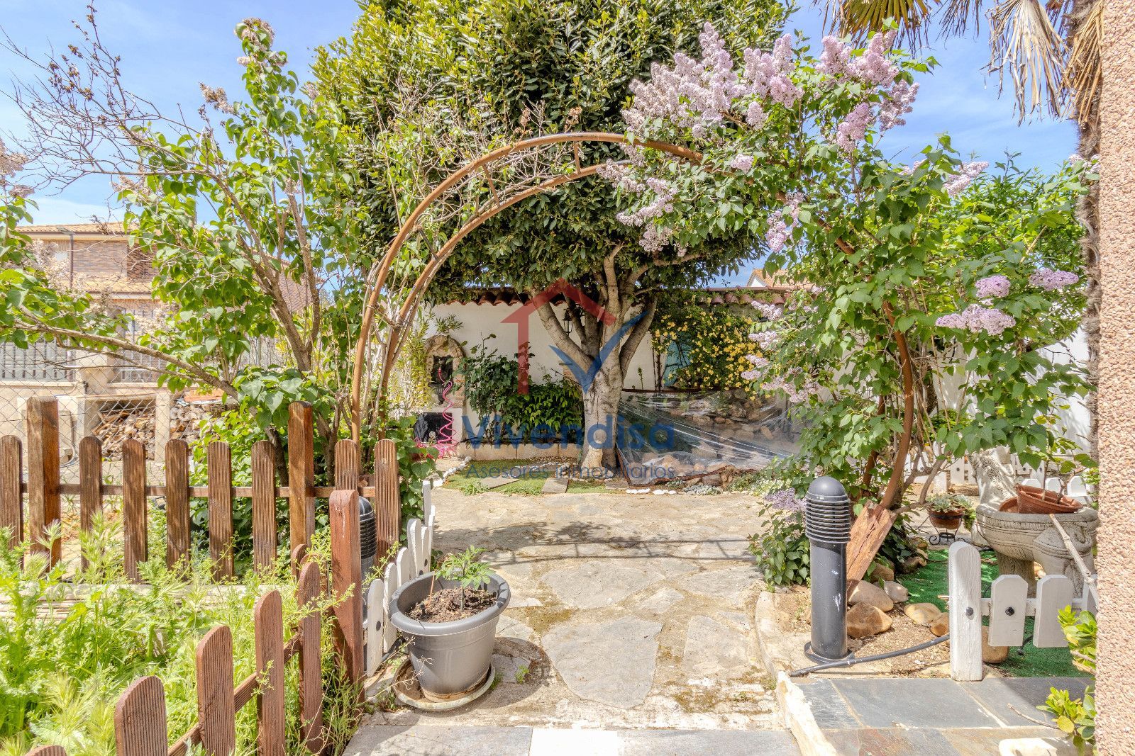 Desde esta planta se accede al jardín, mayoritariamente solado en hormigón, de muy fácil mantenimiento, con detalles en pizarra en la zona frontal y un cenador de obra con mesa integrada, perfecto para comidas y celebraciones al aire libre.